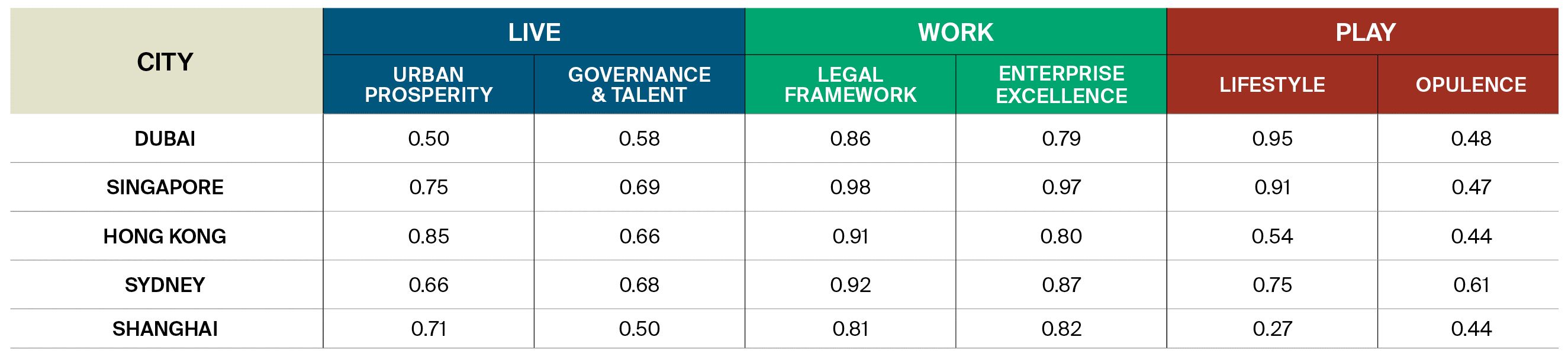 The report assesses the habitability and attractiveness of burgeoning wealth hubs such as Hong Kong using a comprehensive method that investigates six core areas: including urban prosperity, governance and talent, legal framework, enterprise excellence, lifestyle, and opulence. These indicators have been used to build a proprietary model that evaluates cities based on the “live, work, and play” paradigm, with each individual component rated on scale of 0 to 1, with 1 being the highest score.