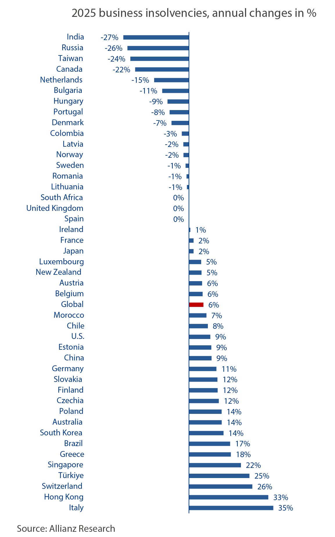 In the first half of 2025, insolvency growth worldwide slowed to 4%, compared to 9% in the same period last year, as companies launched countermeasures, including trade rerouting, lower shipping costs, and price cutting, Allianz says.
