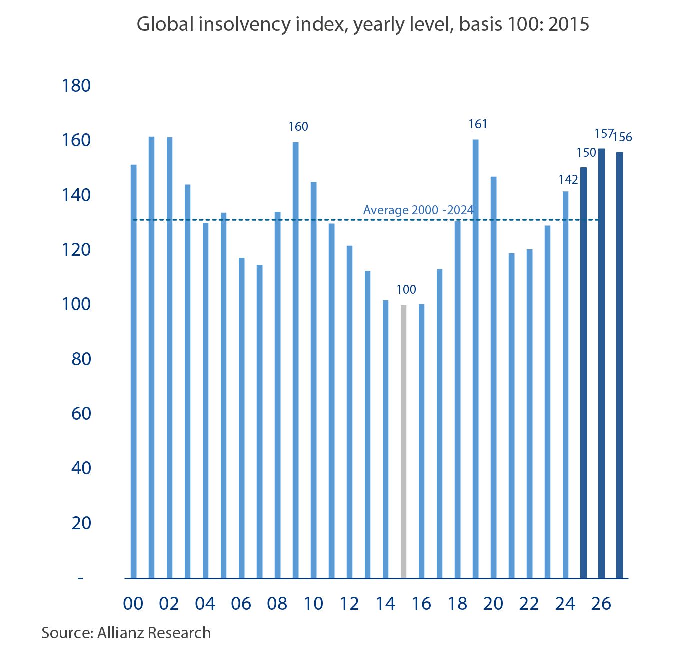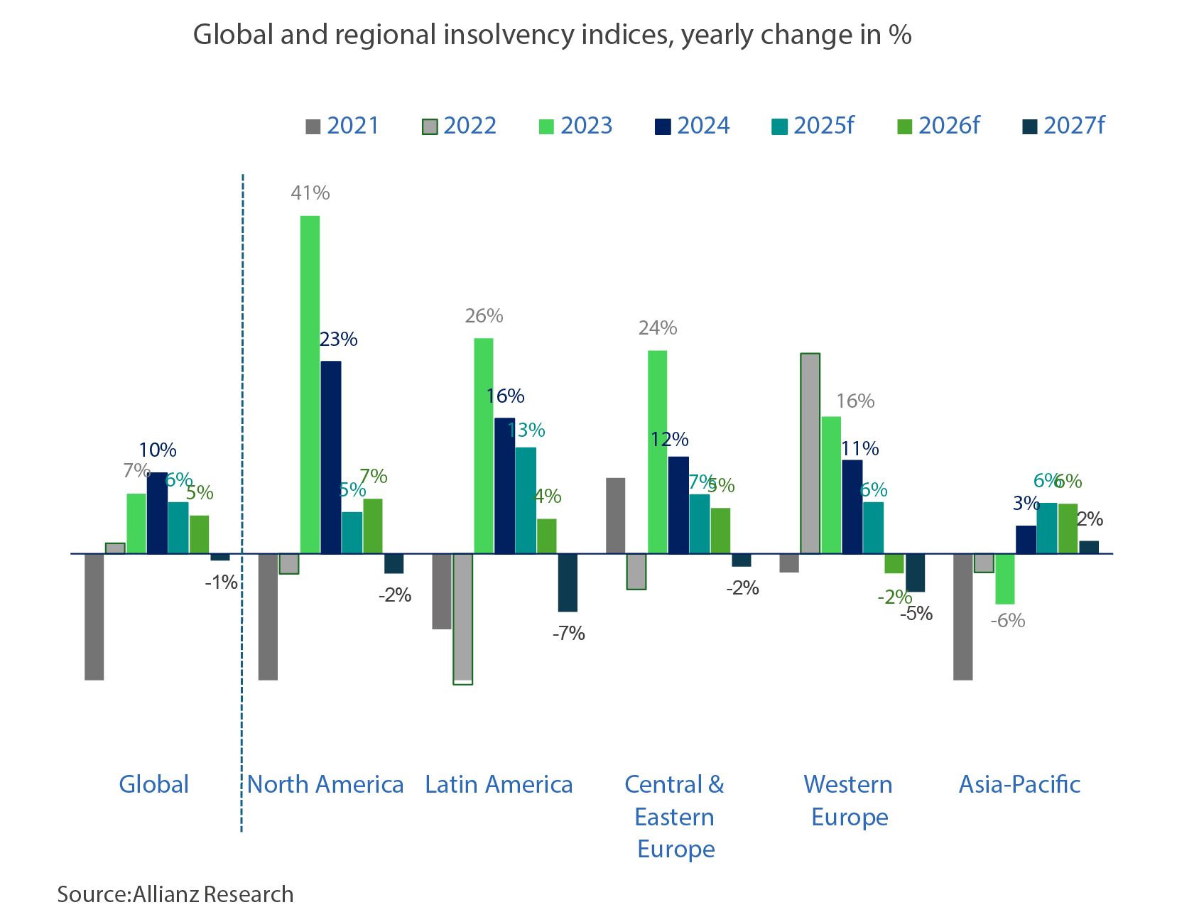 Global insolvency is expected to start declining from 2027, Allianz projects, although Asia is forecast to record a 2% growth that year, skewed by China’s stubborn figure.